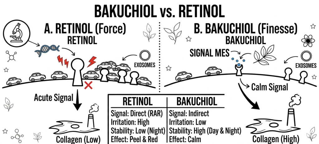 - Bakuchiol’s Subtle Signaling: Bakuchiol does not seem to bind to RARs in the same aggressive way. Instead, it appears to modulate similar signaling pathways (like the retinoic acid-like gene expression) more indirectly. It achieves the “End Goal” (collagen production) without triggering the “Inflammatory Alarm” of the RAR system.