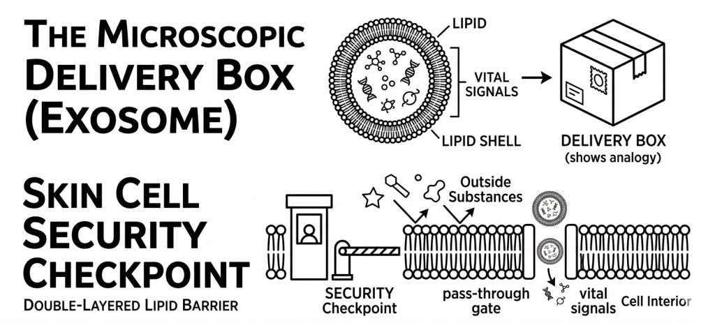Think of an Exosome as a microscopic delivery box. Our skin cells are protected by a double-layered lipid barrier that acts like a strict security checkpoint, blocking most outside substances.