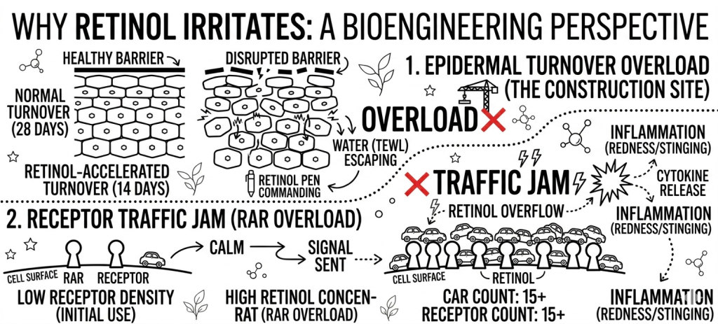 - The Chaos: When you suddenly apply a high concentration of Retinol, it’s like thousands of cars trying to enter a tiny parking lot. This “traffic jam” triggers an inflammatory response, releasing cytokines that cause the redness and stinging sensation you feel. Your skin isn’t “allergic”; it’s simply overwhelmed by too much information at once.